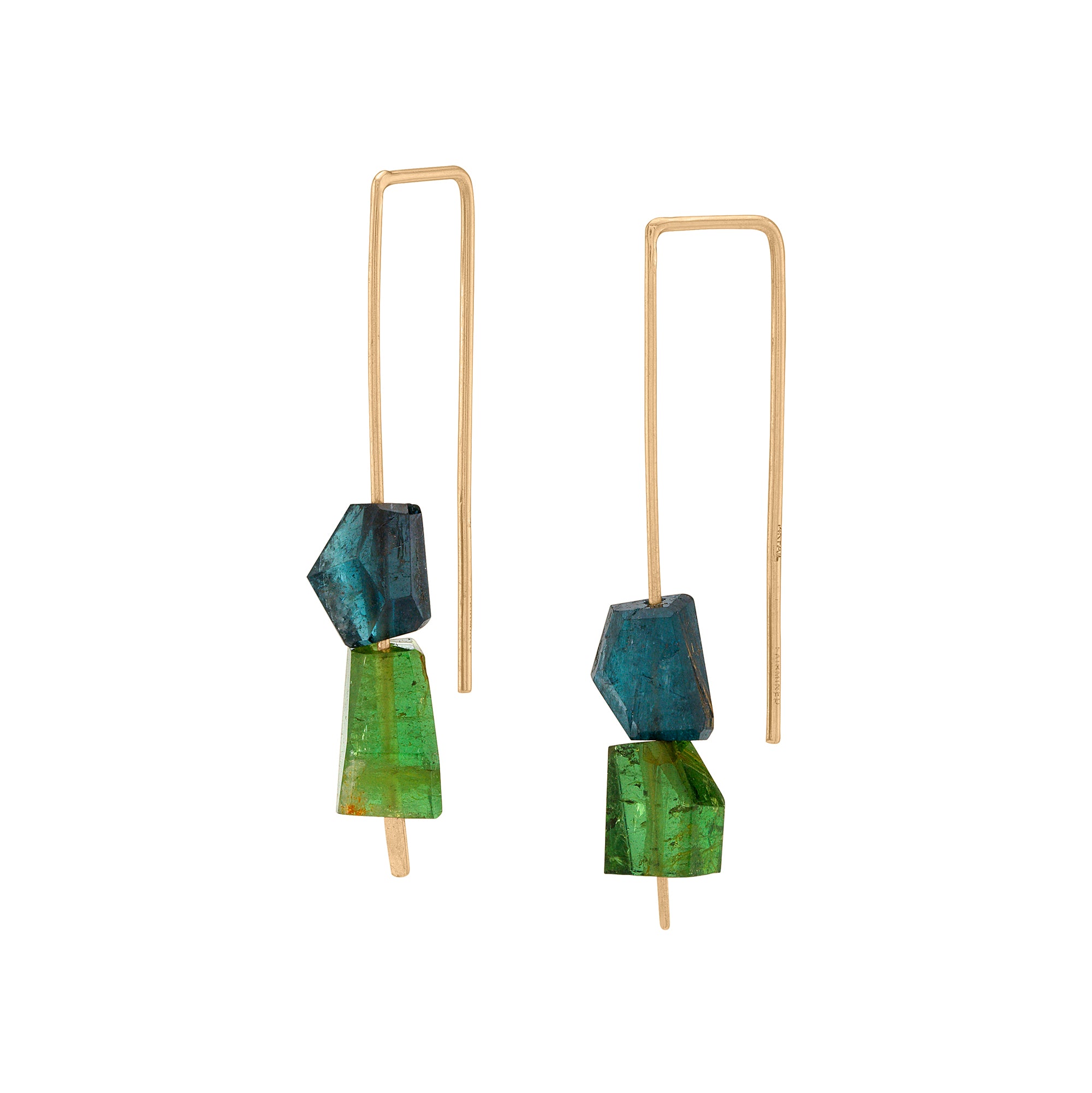 These one-of-a-kind earrings feature indicolite blue and green tourmaline beads stacked on a simple hook style earring. Made from Fairmined® 14k yellow gold, our Medium Hooks are sure to be your new favorite earrings.