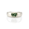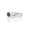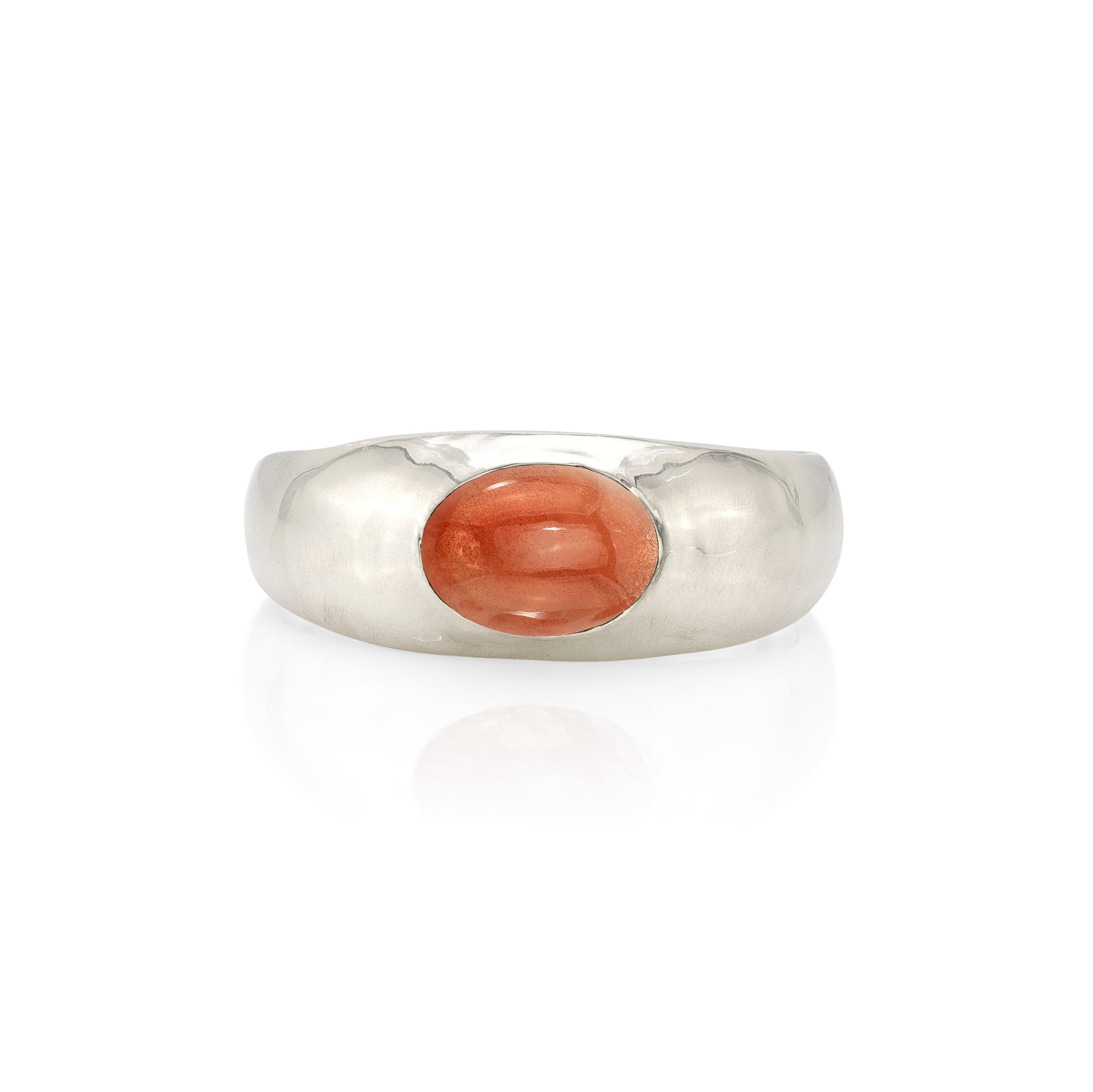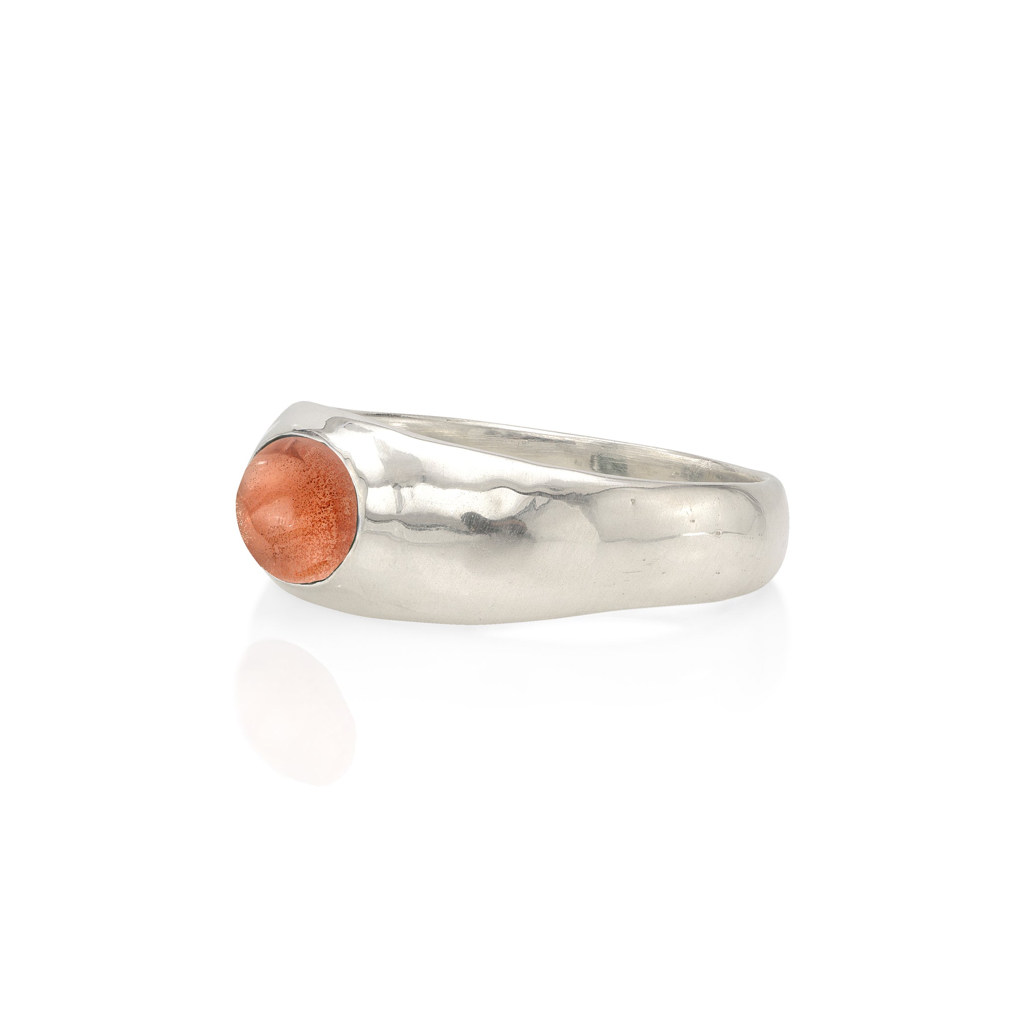A fluid and organic bezel surrounds a large oval cabochon in Moss Agate or Sunstone on a thick band in the Oona solitaire ring.