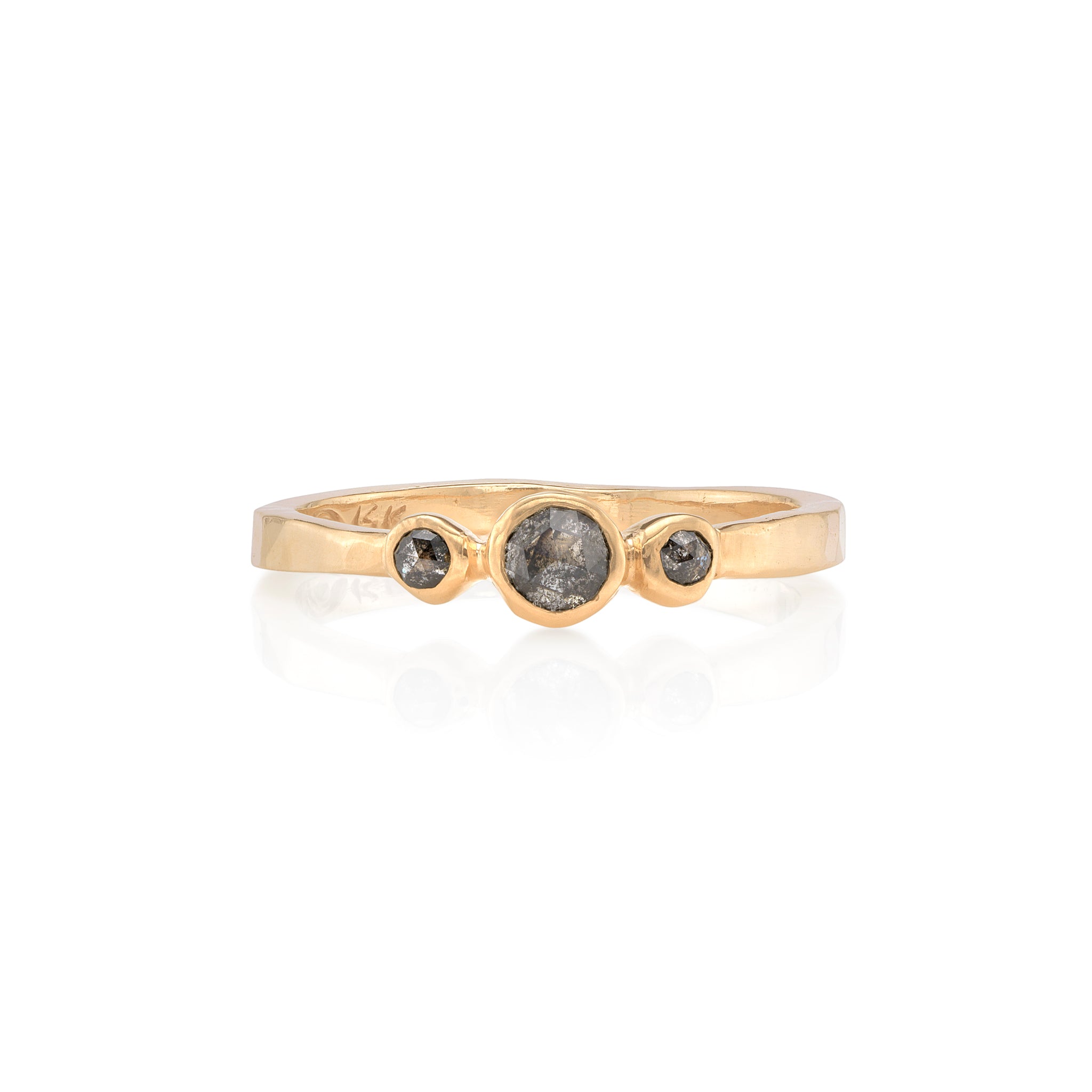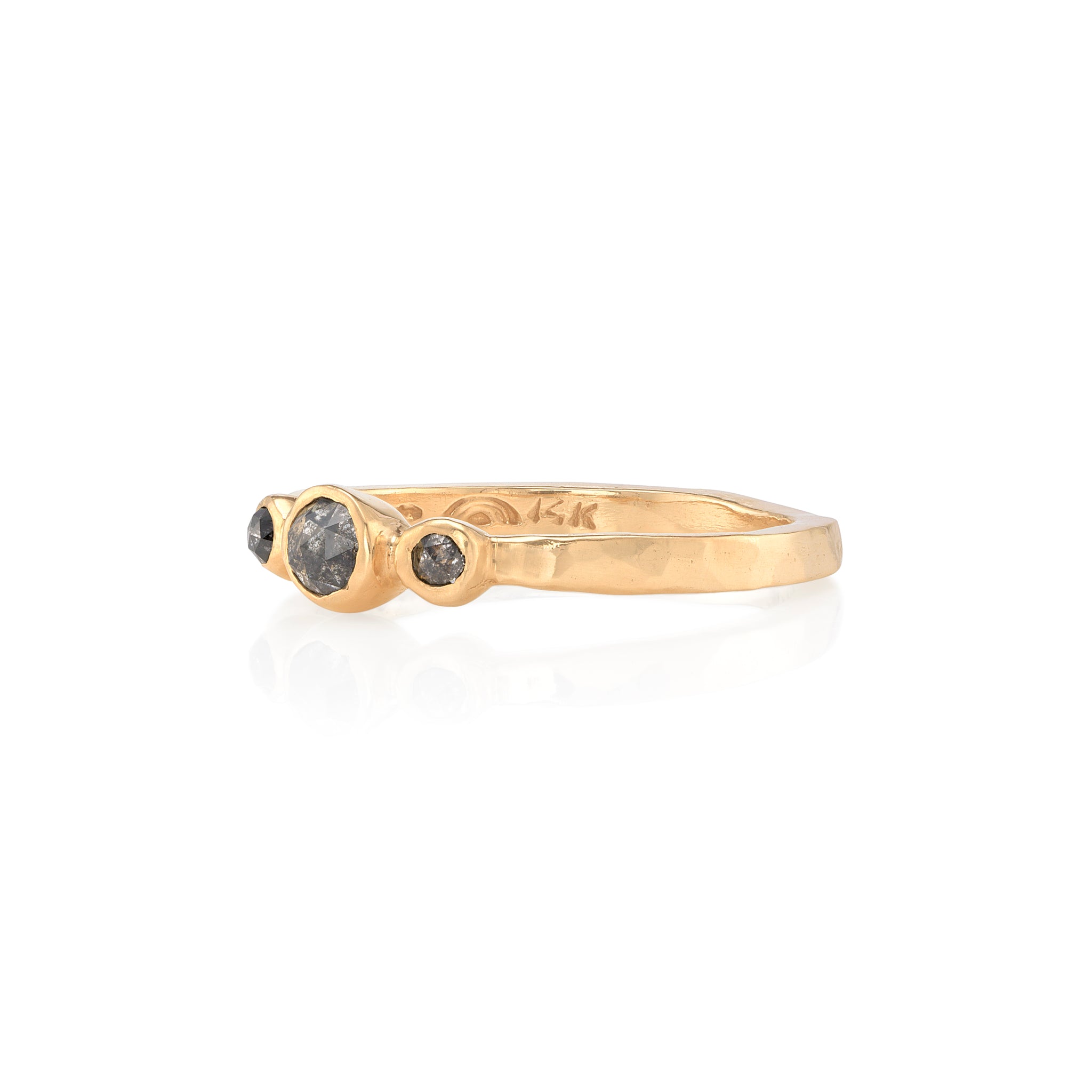 Three round rose cut salt & pepper diamonds bezel set in 14k gold, 0.13tcw. 4.5mm at widest with a 2mm hammered band.